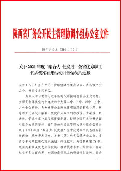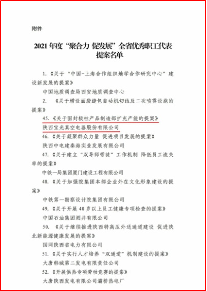 近日,從陜西省總工會傳來喜訊,寶光集團《關于固封極柱產品制造部擴充產能的提案》榮獲陜西省2021年度“聚合力 促發展”全省優秀職工代表提案。