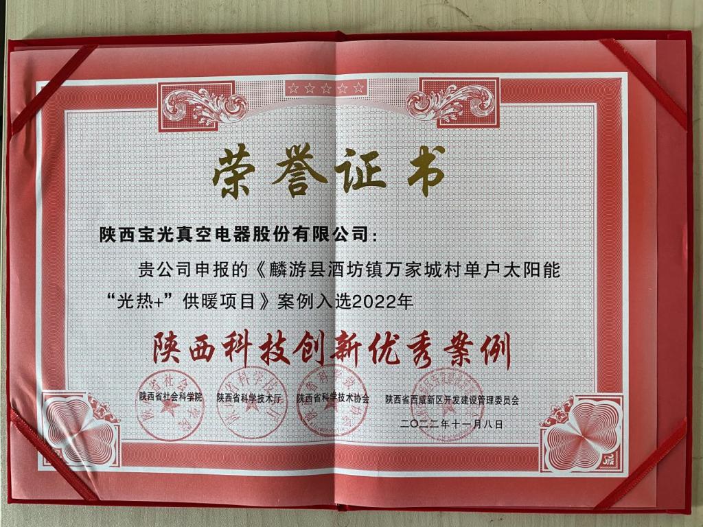 近日,陜西省社會科學院、陜西省科學技術廳、陜西省科學技術協會、陜西省西咸新區開發建設管理委員會聯合發布“2022年陜西科技創新優秀案例”,寶光股份申報的《麟游縣酒坊鎮萬家城村單戶太陽能“光熱+”供暖項目》成功獲選高效治理高品質生活組“陜西科技創新優秀案例”。
